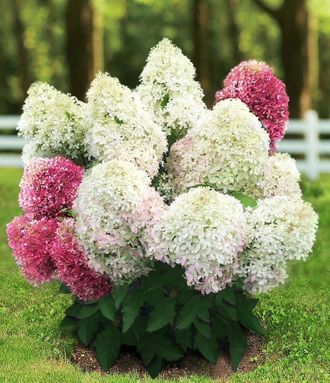 Роял Флауэр гортензия метельчатая (Hydrangea paniculata `Royal Flower`) гортензия среднего размера, её высота 0,9 - 1 м. Имеет пышный куст веерообразной формы, в ширину разрастается до 0,8 - 0,9 м. Изюминка сорта в том, что он имеет пышные, крупные метелки с ослепительно белыми стерильными цветками. В конце цветения на лепестках появляется широкая ярко-розовая кайма, невероятно красивого оттенка, а серединка остается бело-зеленой. На финише цветения мы видим настоящий ситцевый сад. Размер соцветия: 20-25 см. Цветёт с июля по сентябрь.
