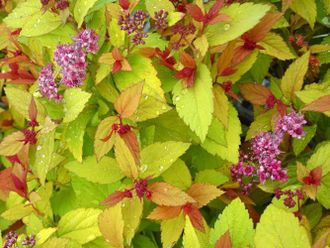 Мэджик Карпет спирея японская (Spiraea japonica Magic Carpet) – поистине удивительный и необычный кустарник для Вашего участка. Magic Carpet с английского языка переводится как «волшебный ковер». Высота 0,4 м. Крона округлая, подушковидная, побеги стелющиеся, тонкие. Листья яйцевидные, зубчатые по краю, при распускании оранжево-красные, очень яркие, постепенно становятся желтыми или лимонно-желтыми. Молодые листочки на верхушках побегах во время вегетации остаются яркими, красными. Осенью листья приобретают оранжево-красные тона. Цветет темно-розовыми цветками в плотных, плоских щитковидных соцветиях, с конца июля до сентября. Растет быстро.
